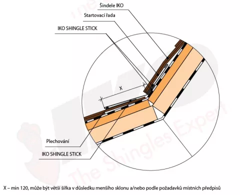 Pokud je zlom mezi sklony větší, je potřeba použít plechování. To se nainstaluje na asfaltový pás IKO Armourabse Thermo AD, ale pod podkladní pás a vrstvu šindelů na horním větším sklonu střechy a vyvede se na již instalované šindele na spodním nižším sklonu střechy tak, aby veškerá voda z vyšší střechy přetékala na nižší sklon a neměla možnost jakkoliv pod šindele na nižším sklonu střechy zatéct.