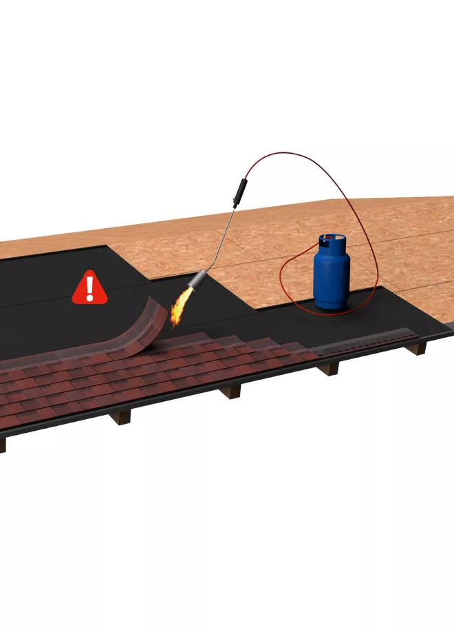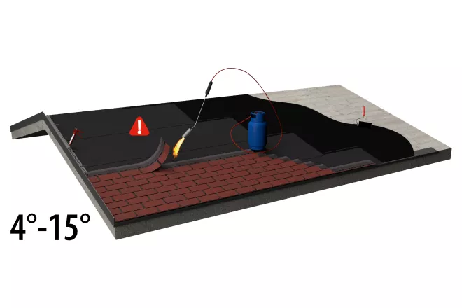 Torch-on application of shingles on OSB wooden deck on slope between 4° and 15°